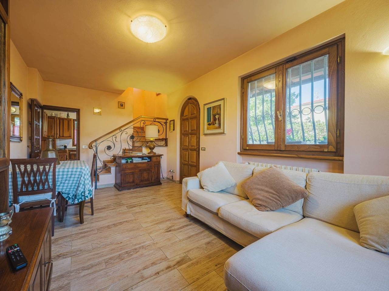 Al piano terra si accede tramite un ingresso che conduce ad un luminoso soggiorno, cucina abitabile, una camera da letto, un bagno e comodo ripostiglio. Al piano superiore si sviluppa la zona notte, composta da due ampie camere matrimoniali, un secondo bagno finestrato e un pratico vano armadi. L’abitazione è circondata da un piacevole spazio esterno ideale per pranzi e cene all’aperto, oltre a offrire la possibilità di parcheggiare comodamente più auto all’interno del giardino privato.